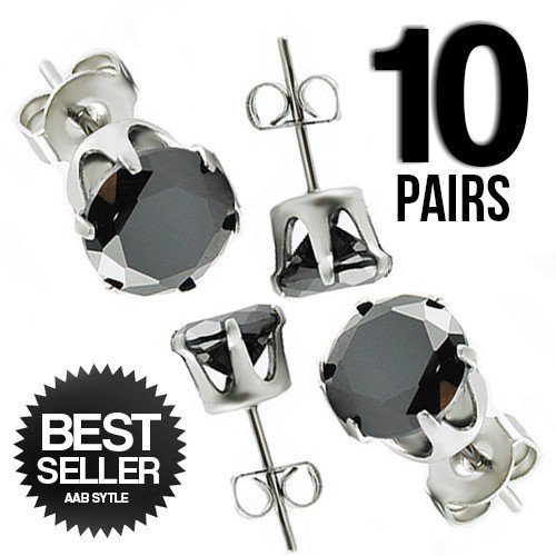 10 PAIRS PCK Stainless Steel Black Round CZ Ear Stud