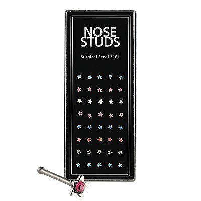 This Case Includes 40 Surgical Steel Jeweled Star Shaped Nose Studs in Assorted Colors.