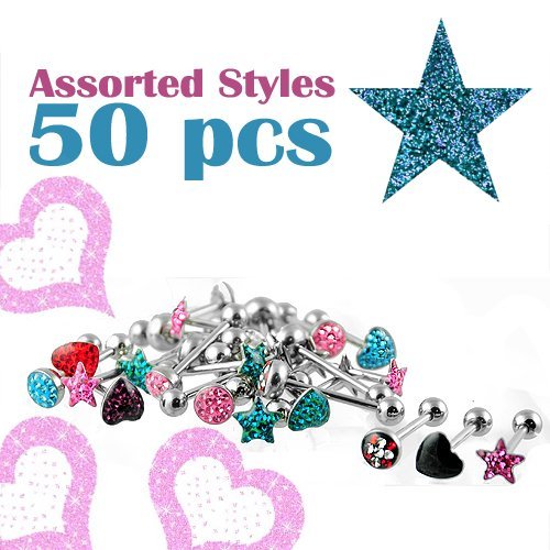 Surgical Steel Barbell Package With Beautiful CZ Encrusted Stars, Hearts And Dome Shaped Pieces. This Package Contains 50 Pieces Of Assorted Shapes And Colors!!
