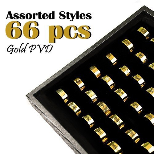 This package includes 66 assorted rings – 10 different styles. The sizes are mixed ? from size 5 to size 12.5. No option to choose styles or sizes.