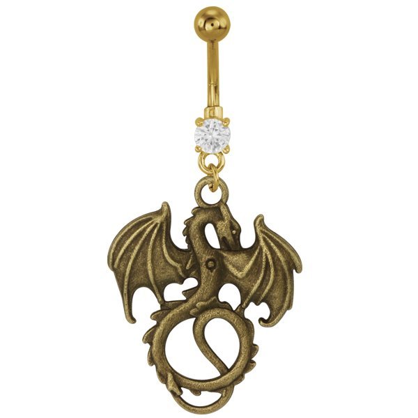 Antique Brass Base Metal Dangling Dragon Charm on Surgical Steel Gold PVD Jeweled Navel Belly Ring.