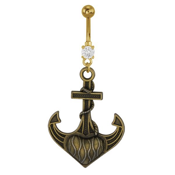 Antique Brass Base Metal Dangling Nautical Heart Anchor Charm on Surgical Steel Gold PVD Jeweled Navel Belly Ring.