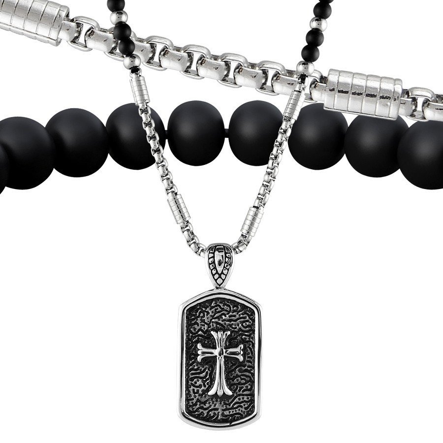 Beaded Necklace With Stainless Steel Chain & Dog Tag Cross Pendant