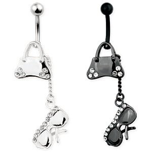 Black PVD Belly Ring With Jeweled Handbag And Dangling Sunglasses. This Item Comes In Steel (Not Shown In Picture) And Black PVD.