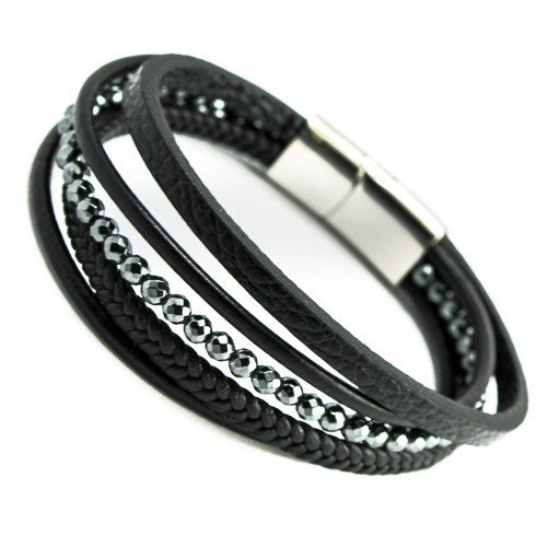 Black Leather Multi Strand Bracelet w/ Stainless Steel Closure w/ Hematite Beads