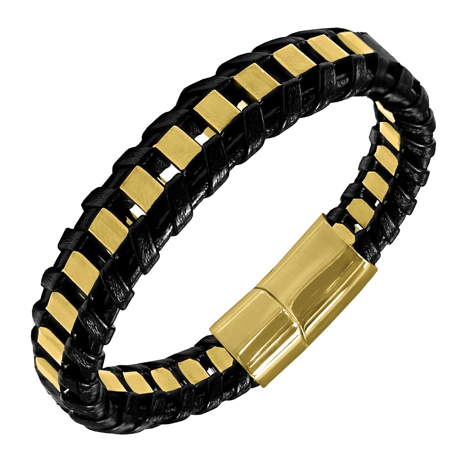 Black Leather & Stainless Steel Gold PVD Bracelet