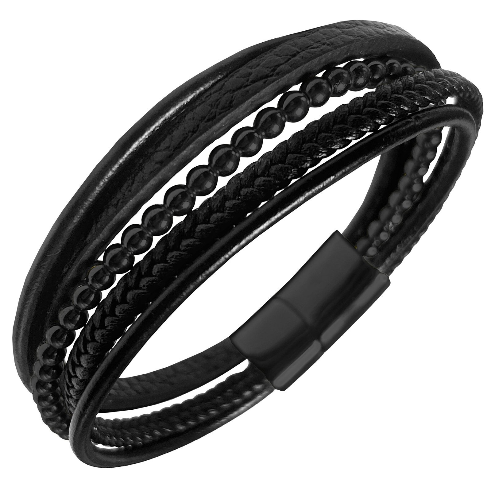 Black Multi-String Leather & Stainless Steel Bracelet w/ Onyx Beads