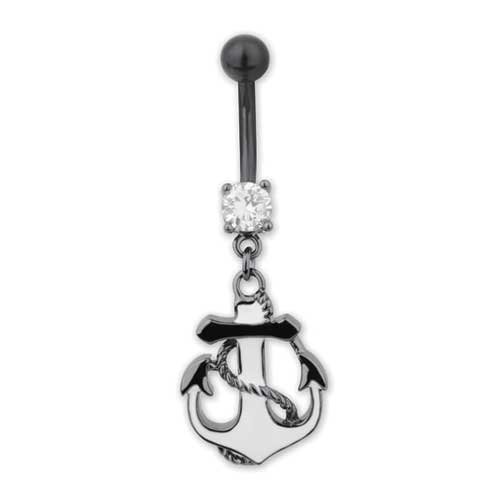 Black PVD Belly Ring With CZ Stone And Dangling White and Black Outlined Anchor.