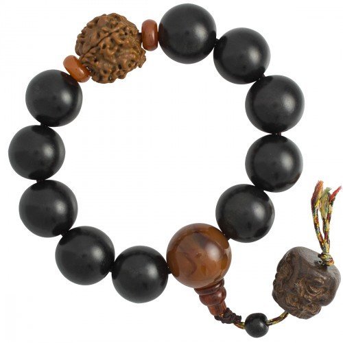 Black Wood Beaded Mala Bracelet with Buddha Faces Dangle