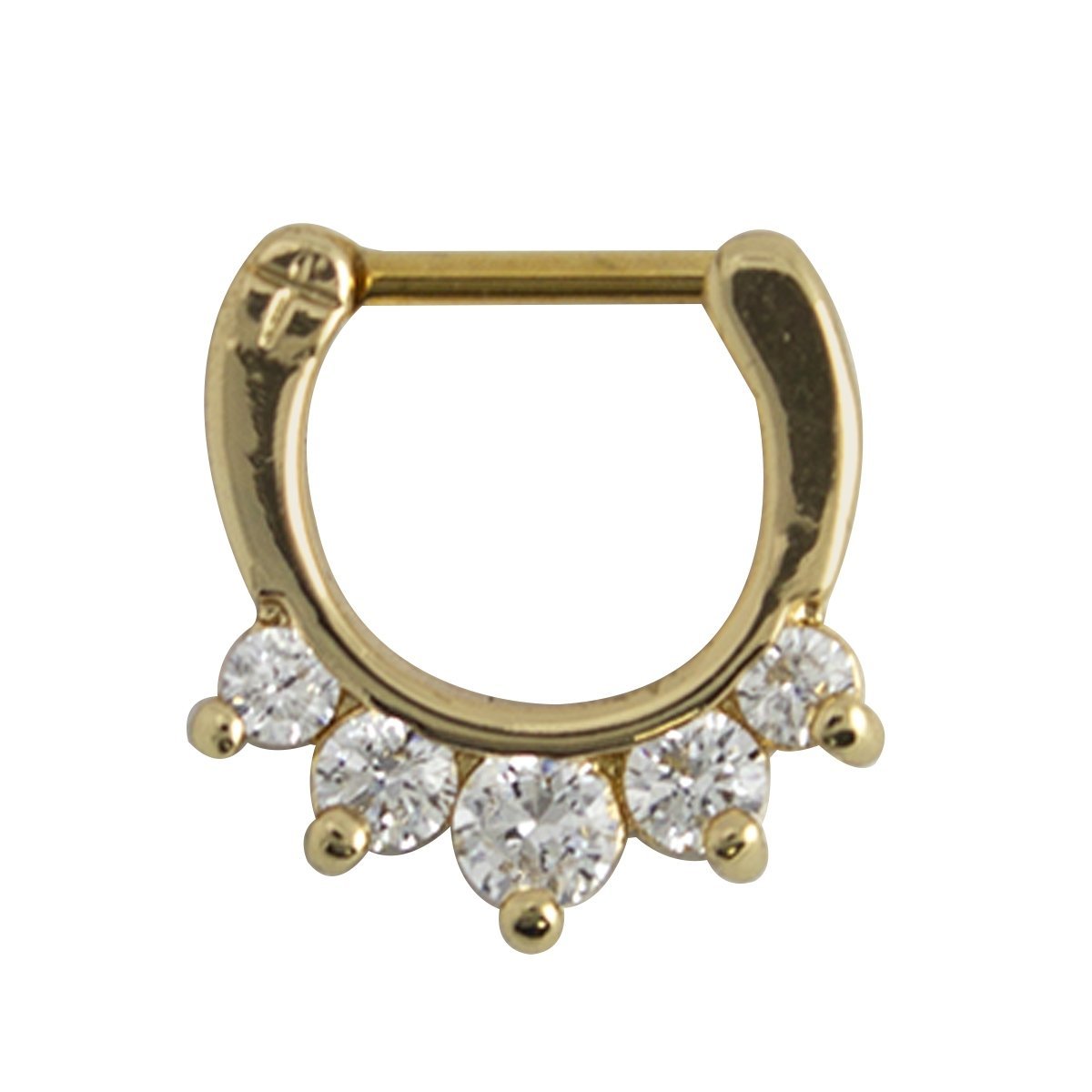 Gorgeous Stainless Steel Septum Jewelry Coated in Gold PVD with Prong Set Clear CZ Stone.