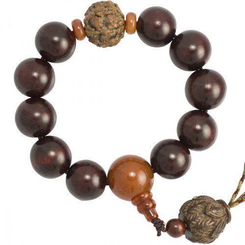 Dark Cherry Wood Beaded Mala Bracelet with Wood Lotus Pendant