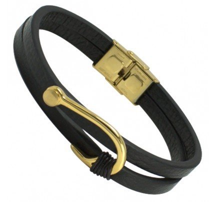 Double Black Leather Bracelet with Stainless Steel Gold PVD Fisher Hook Charm