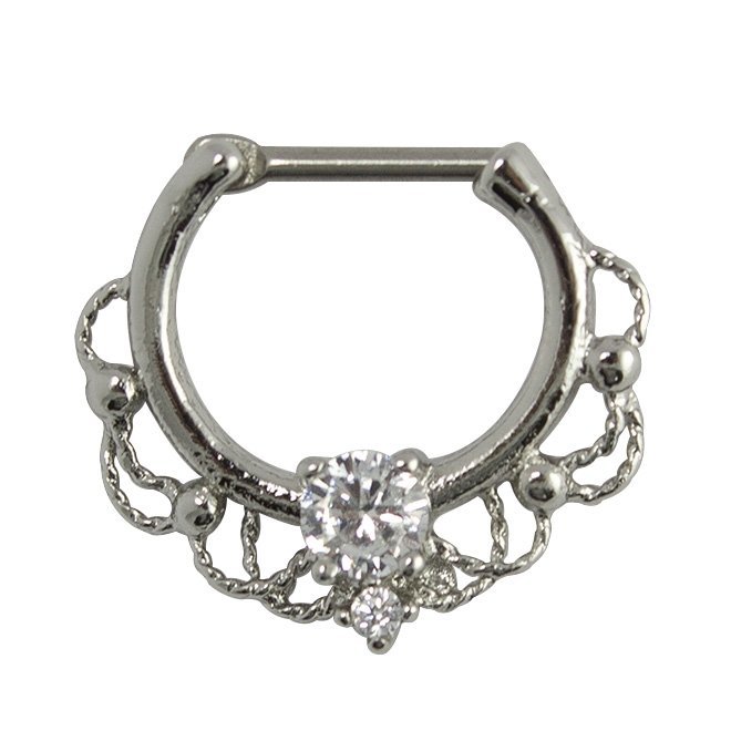 Elegant Stainless Steel Filigree Septum Clicker with Center Jewels.