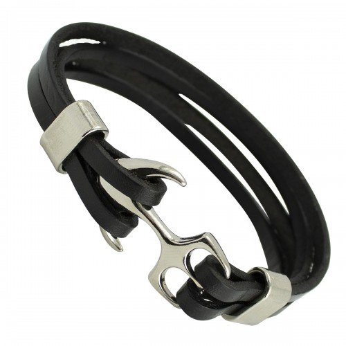 Fashionable Black Leather Bracelet with Base Metal Anchor