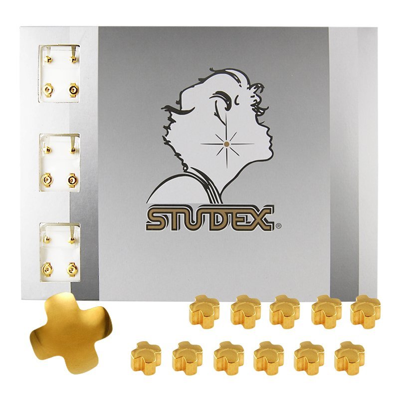 Gold Plated Stainless Steel Sterilized Cross Shaped Ear Piercing Studs. Each Box Includes 12 Pairs Of Sterilized Studex Brand Ear Piercing Studs.