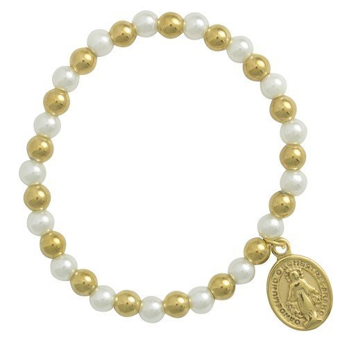 Gold PVD and White Pearl with Mary Charm Bracelet
