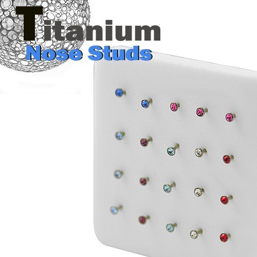 Grade 23 Titanium Jeweled Nose Bone Pack. This Display Box Includes 20 Nose Studs With Assorted CZ Stones.