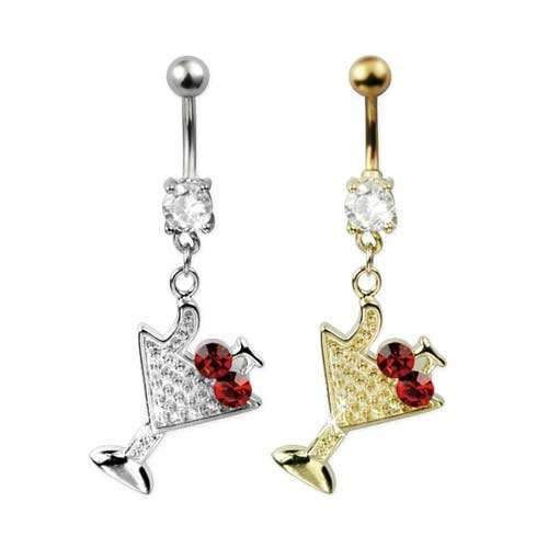 Jeweled Belly Ring With Dangling Martini Glass. This Item Is Available In Steel Or Gold PVD