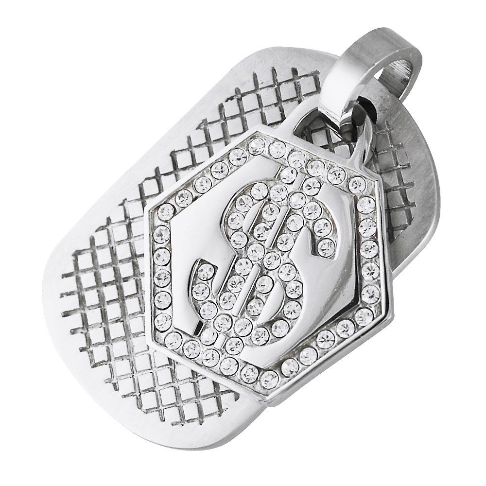 Large Stainless Steel Pendant with Textured Dog Tag and Crystal Dollar Sign.