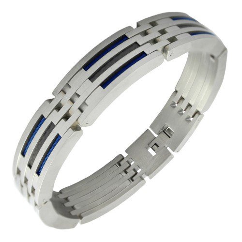 This bracelet is made from high quality 316L Stainless Steel, and has blue steel cable and carbon fiber accents