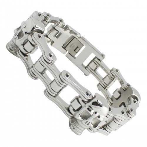 Motorcycle Chain with Skulls Bracelet and alligator fold over clasp. Men’s top Seller.