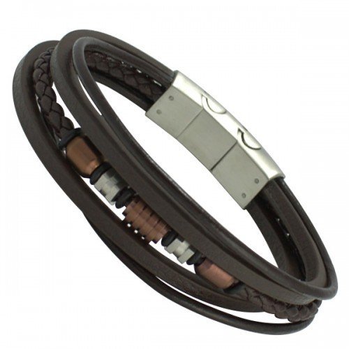 Brown Leather Multi Strand Bracelet (4 Strands) And Centered Brown PVD And Stainless Steel Accent Beads On A Braided Strand. With Stainless Steel Adjustable Closure