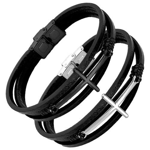 Multi String Leather w/ Stainless Steel Sideways Cross Bracelet quantity