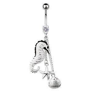 Stainless Steel Jeweled Belly Ring with Sea Horse, Star Fish and Shell.