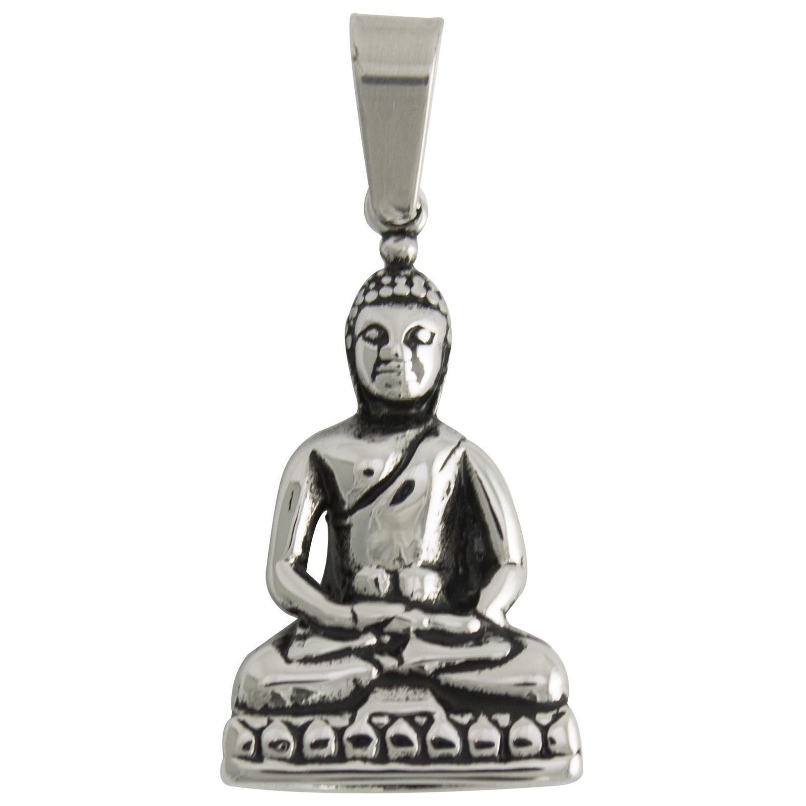 This harmonious pendant of Buddha in a lotus seated position is 30mm long and the bail can accommodate a chain up to 5mm thick.