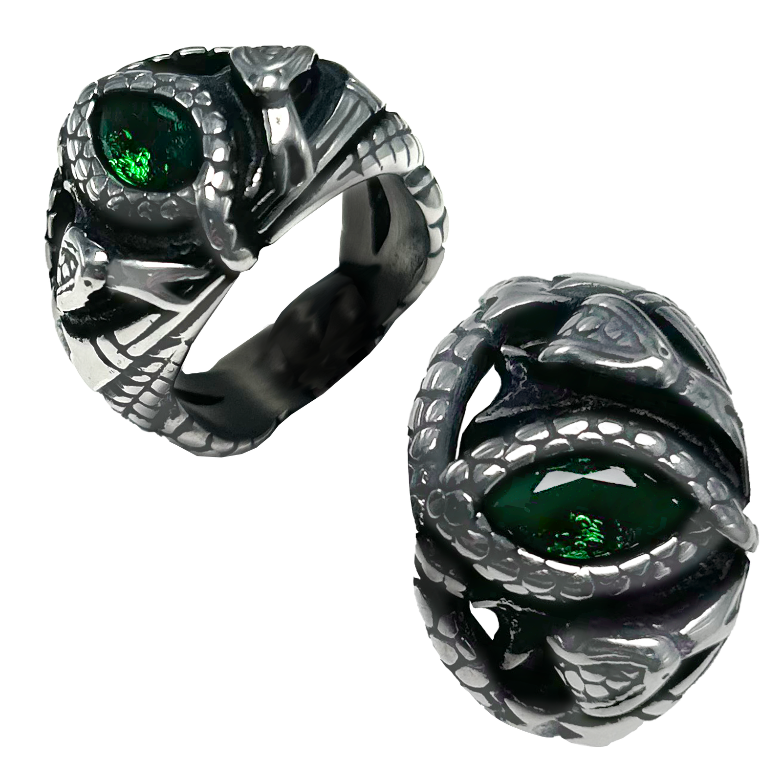 Stainless Steel Biker & Snake Ring with Green cz