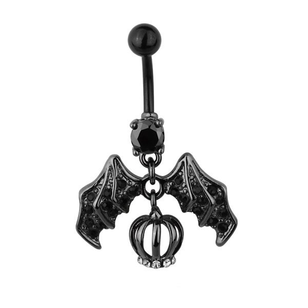 Stainless Steel Black PVD Dangling Belly Ring with Jeweled Bat Design and CZ Charm