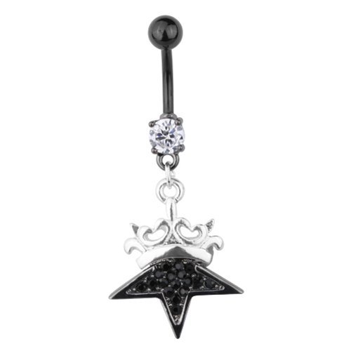 This Black PVD Jeweled Belly Ring has a Dangling Black Star with a Crown On Top