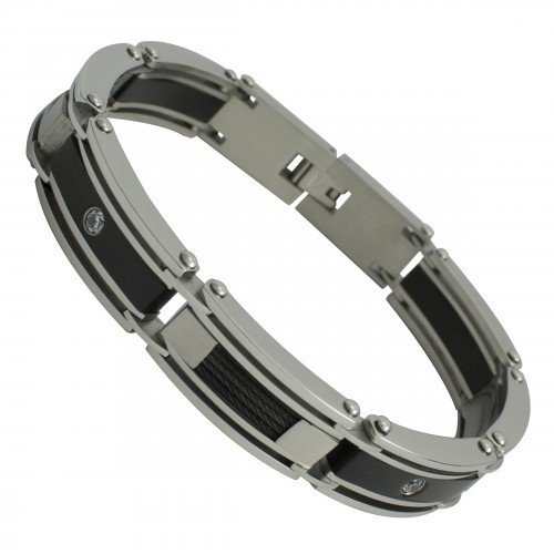 Beautiful Stainless Steel Mens Bracelet w/ Black PVD, Cable, And CZ Accents. This Bracelet Is Very Detailed In Construction and Is Has a Very Modern Design.