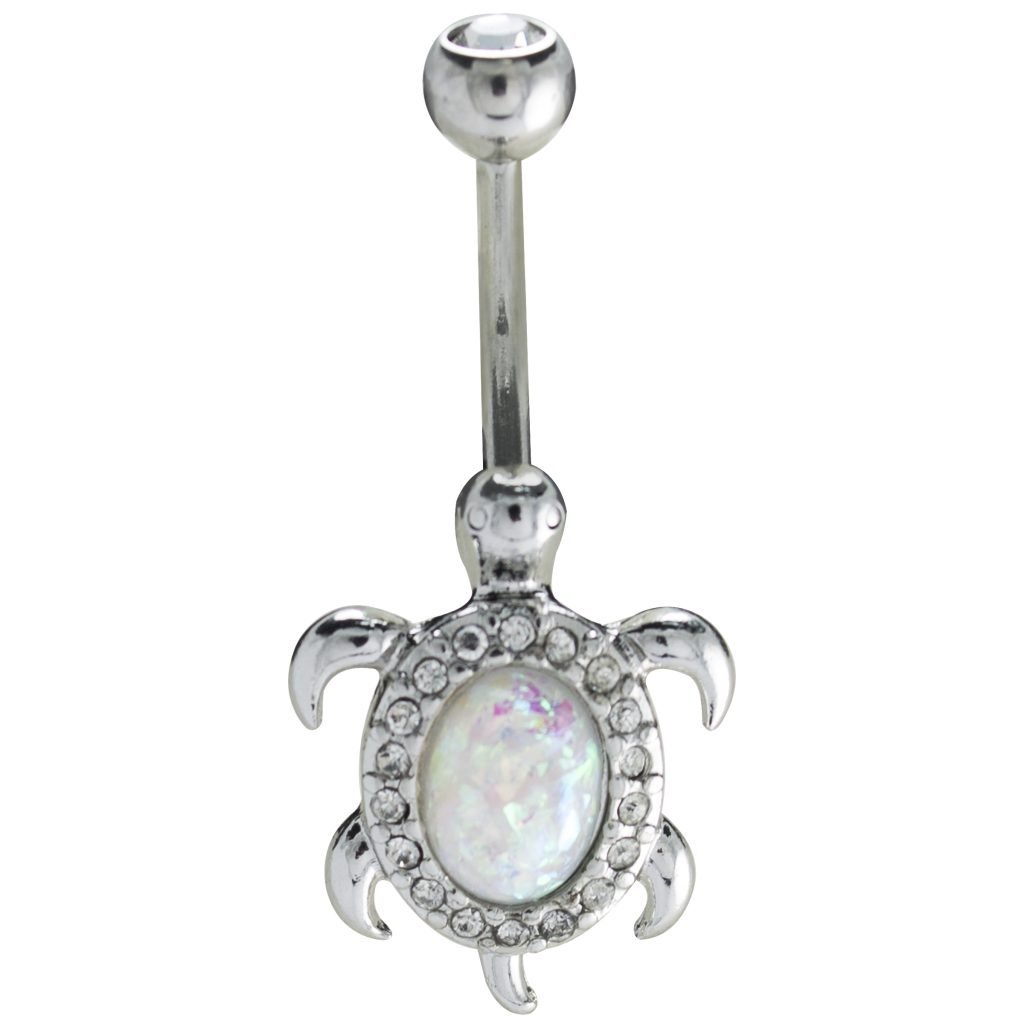 Stainless Steel Encrusted Turtle with White Opal Stone Belly Ring