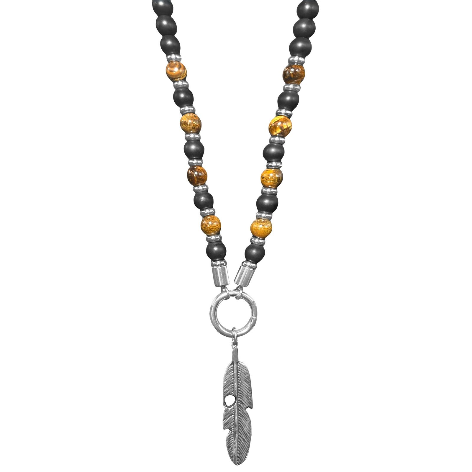 Stainless Steel Feather w/ Black & Tiger Eye Beaded Necklace
