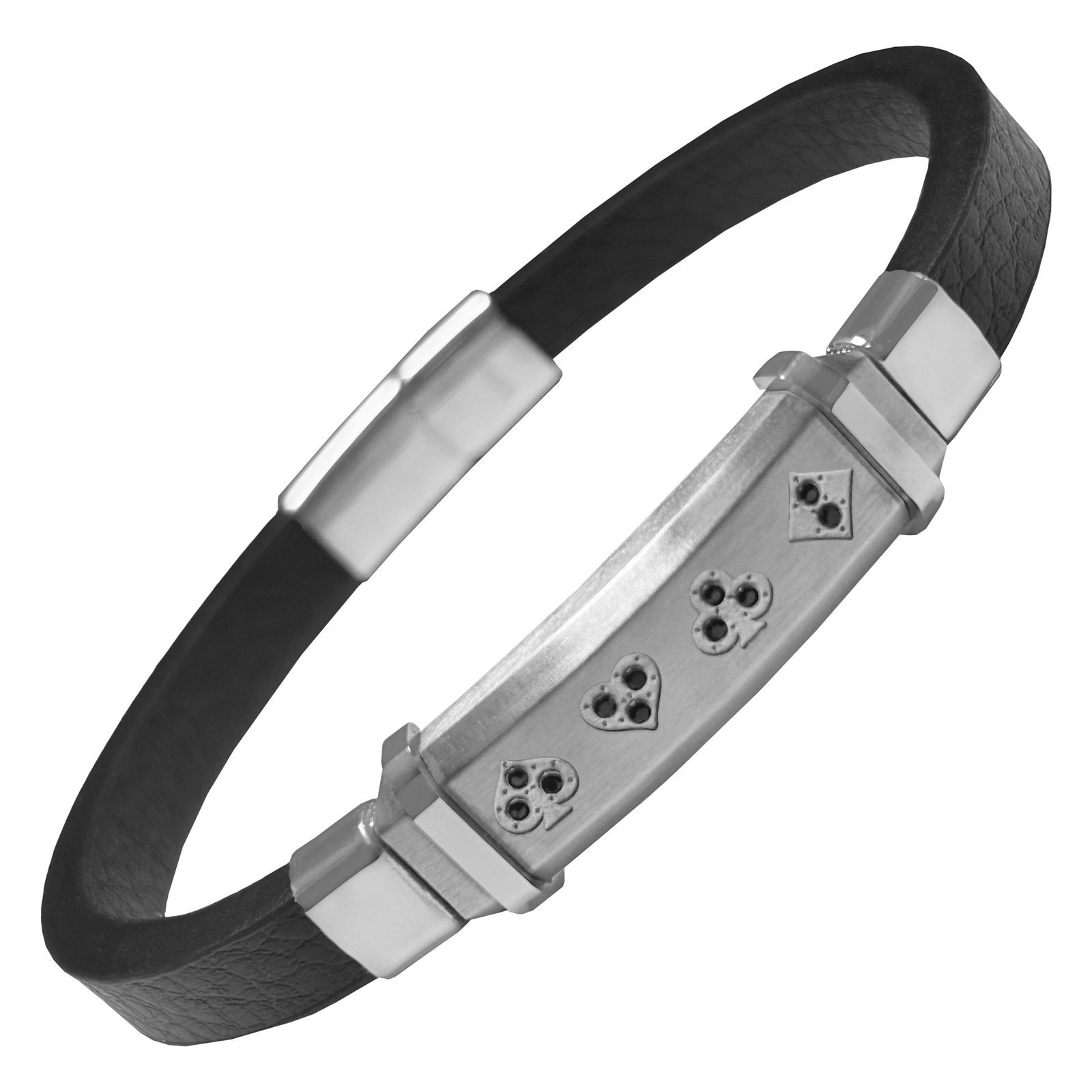 Stainless Steel Four Suits w/ Black CZ & Leather Bracelet