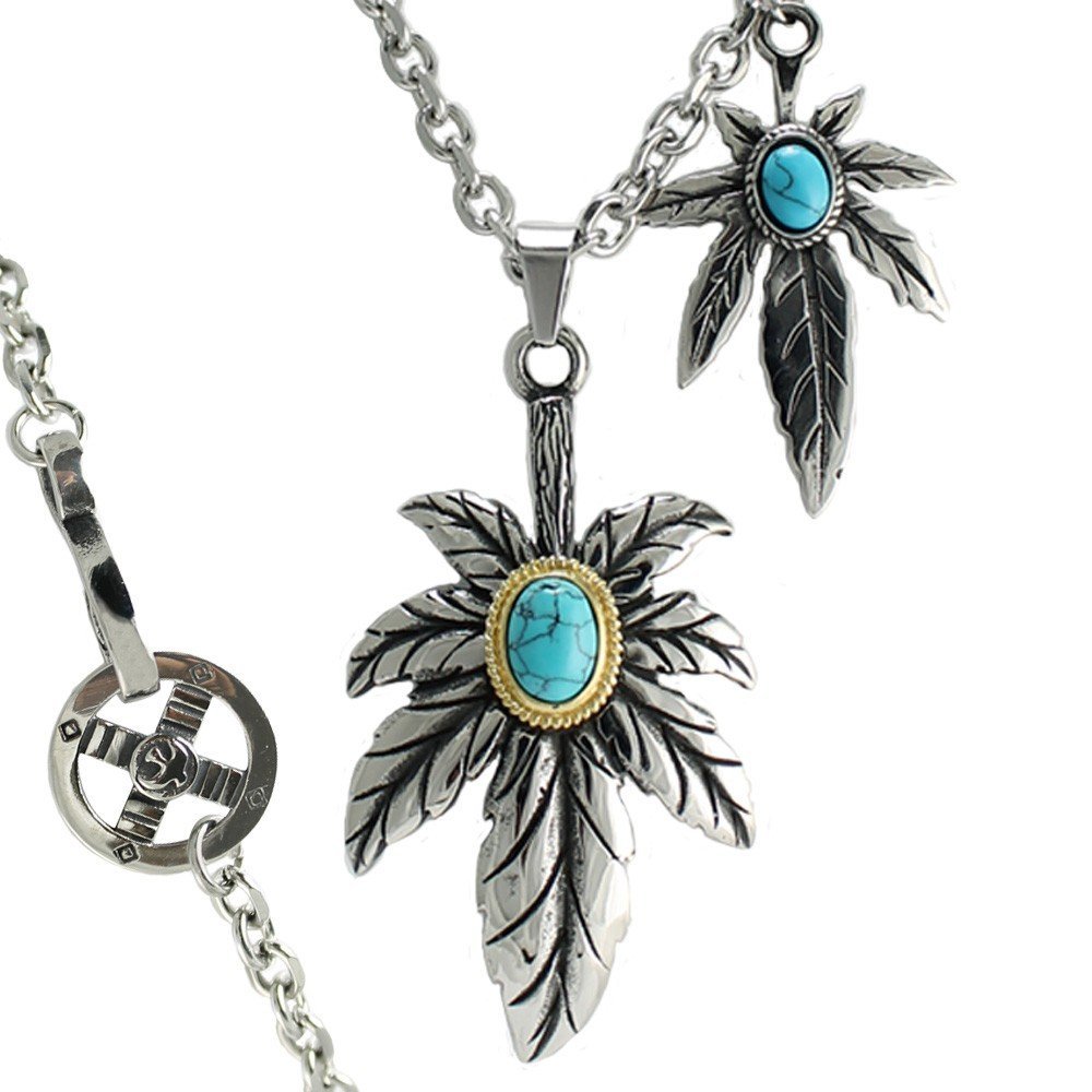 Stainless Steel Hemp Leaf Pendant with Turquoise Accents in Center On Rolo Chain quantity
