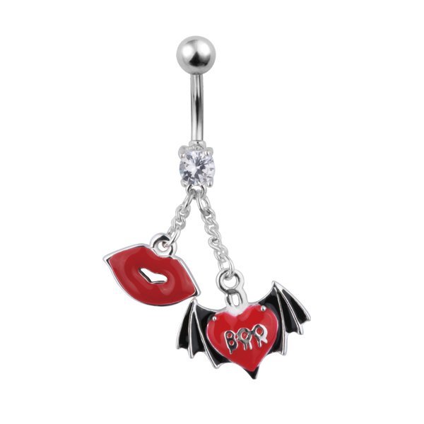 This Beautiful Jeweled Belly Ring Has Dangling Lips and a Heart with Bat Design