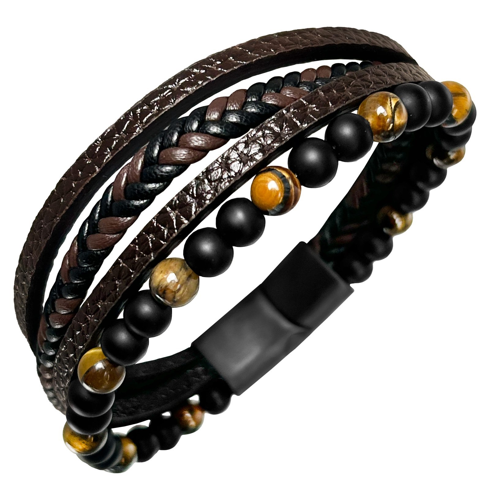 Stainless Steel & Leather Bracelet w/ Tiger Eye Beads