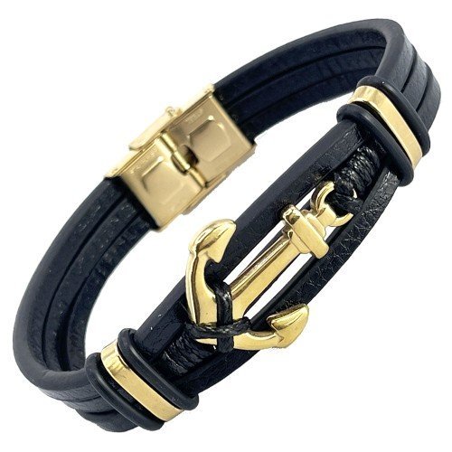Stainless Steel Leather Bracelet with Gold Anchor