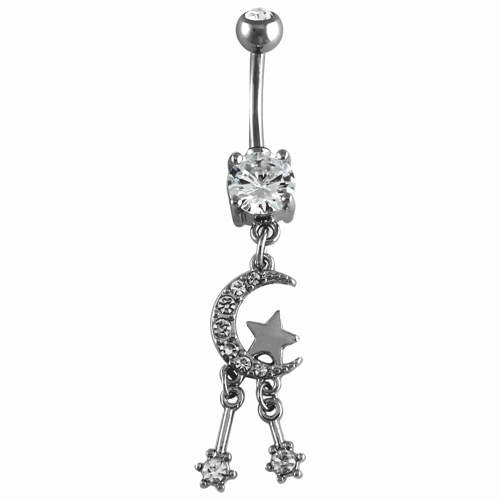 Stainless Steel Moon & Star CZ Dangle Belly Ring