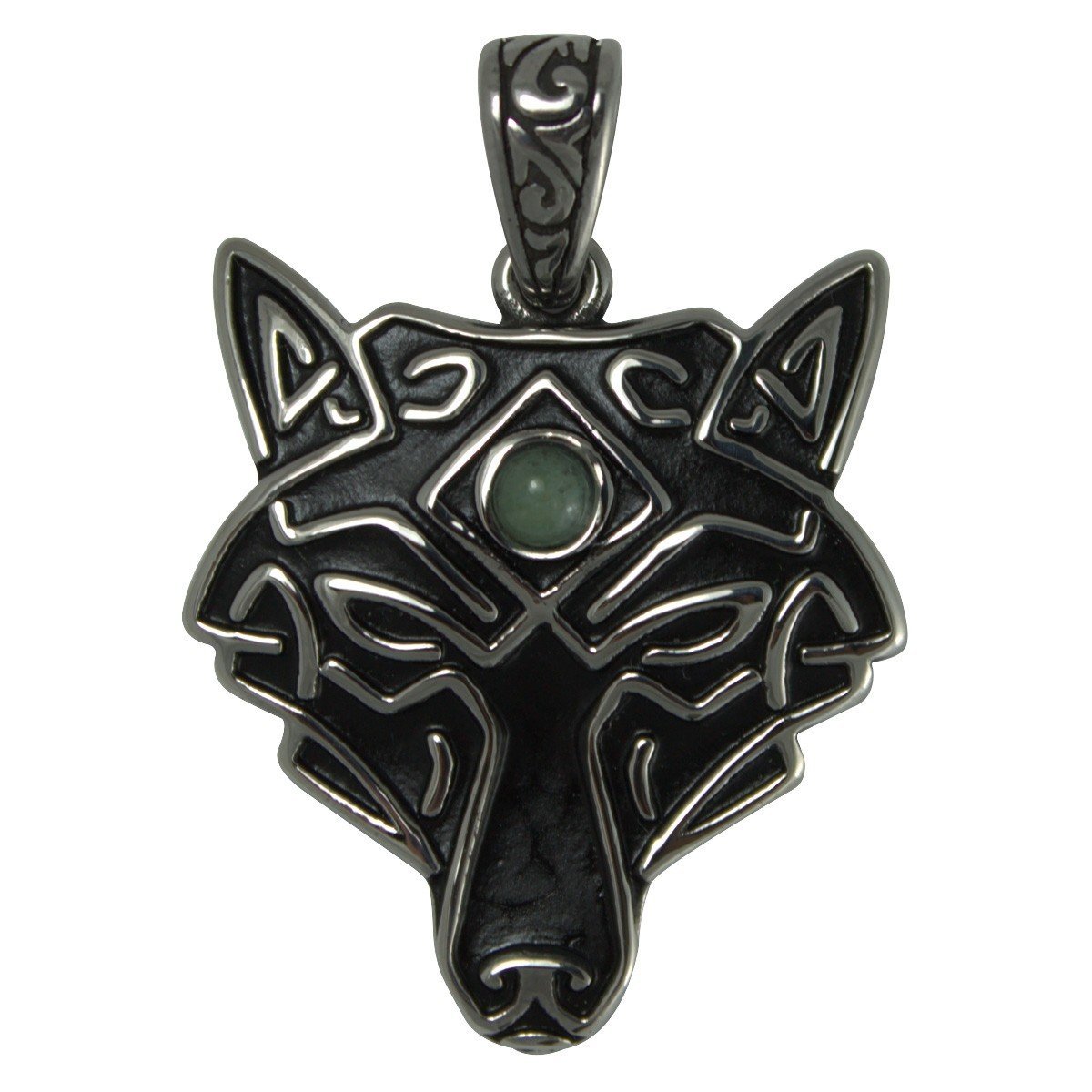 Stainless Steel Mystic Native Wolf Pendant with Green Stone