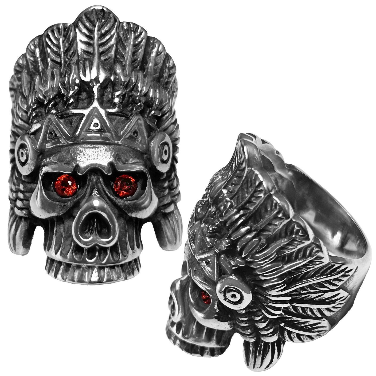Stainless Steel Native Skull w/ Red Eyes Ring