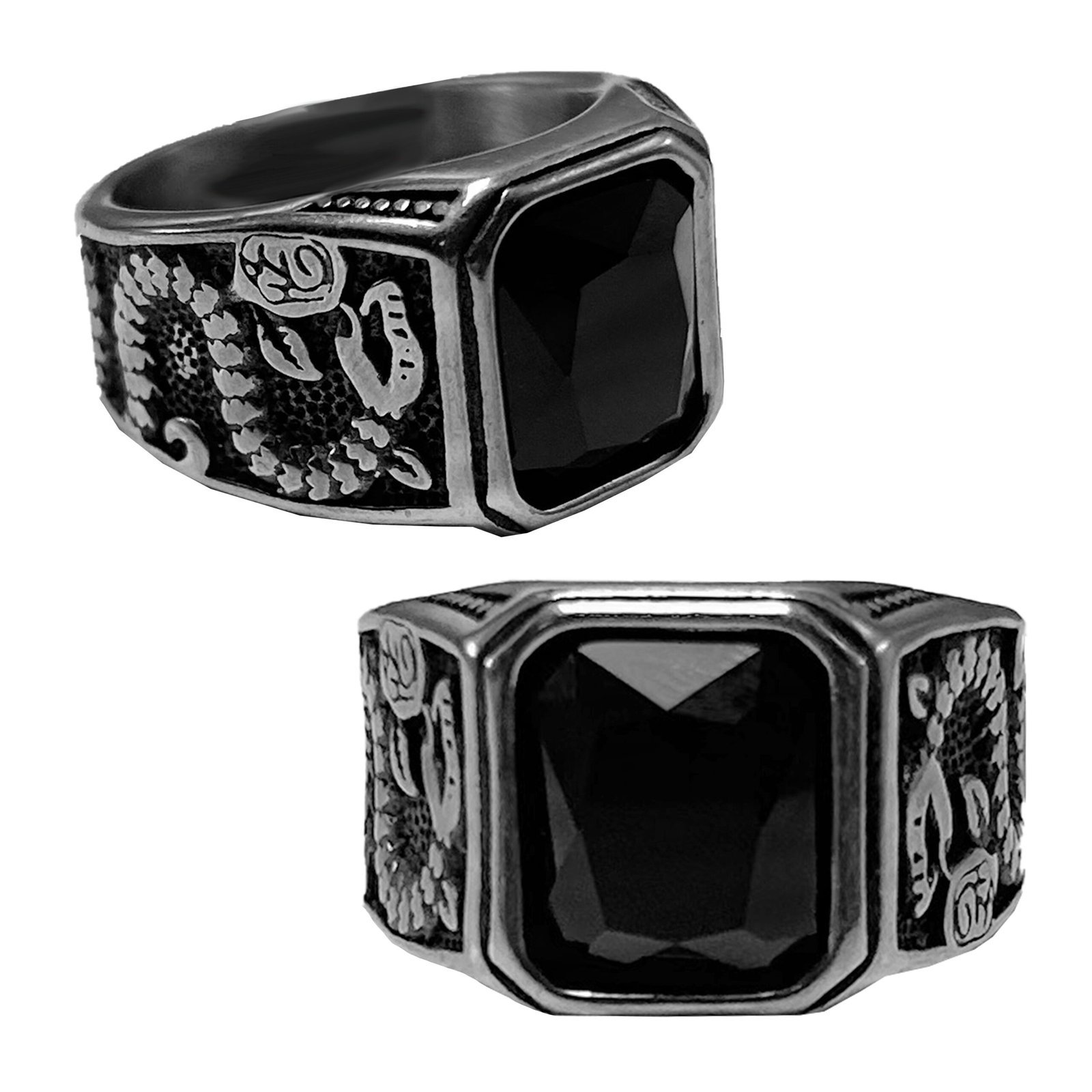 Stainless Steel Ring with Black Stone and Snakes
