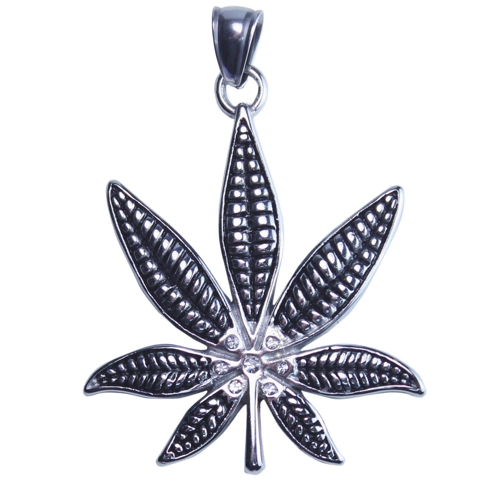 Stainless Steel Silver with 7 Cubic Zirconia Jewels Encrusted in Hemp Leaf Pendant