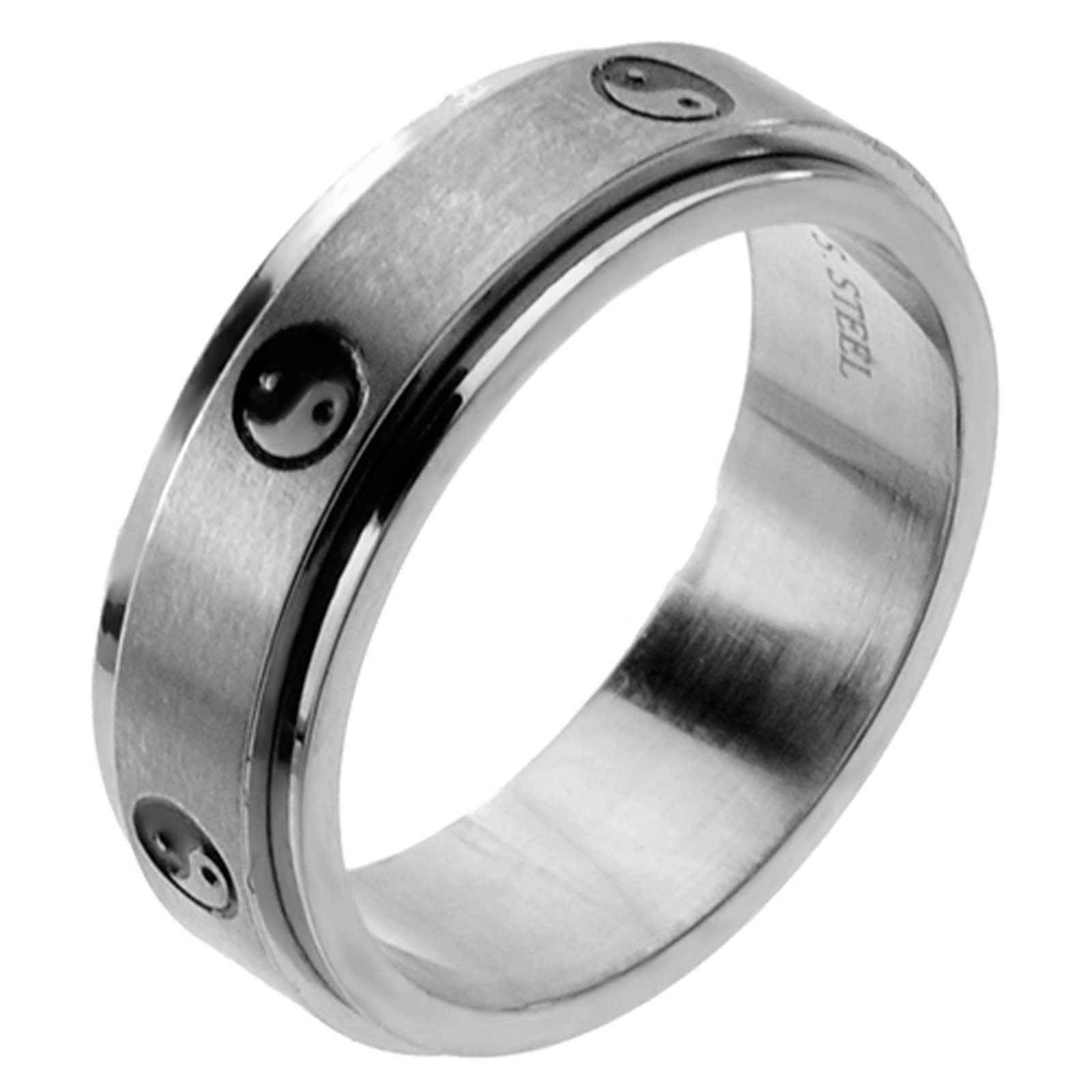 Stainless Steel Spinner Ring with the Yin Yang symbol engraved with black enamel.