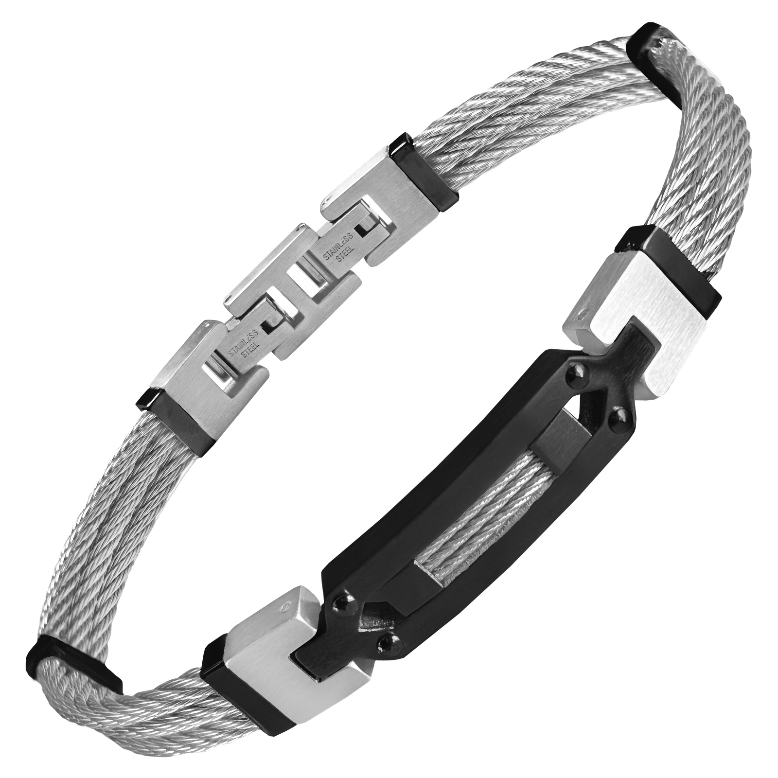 Stainless Steel Triple Cable Wire Bracelet w/ Black Accents