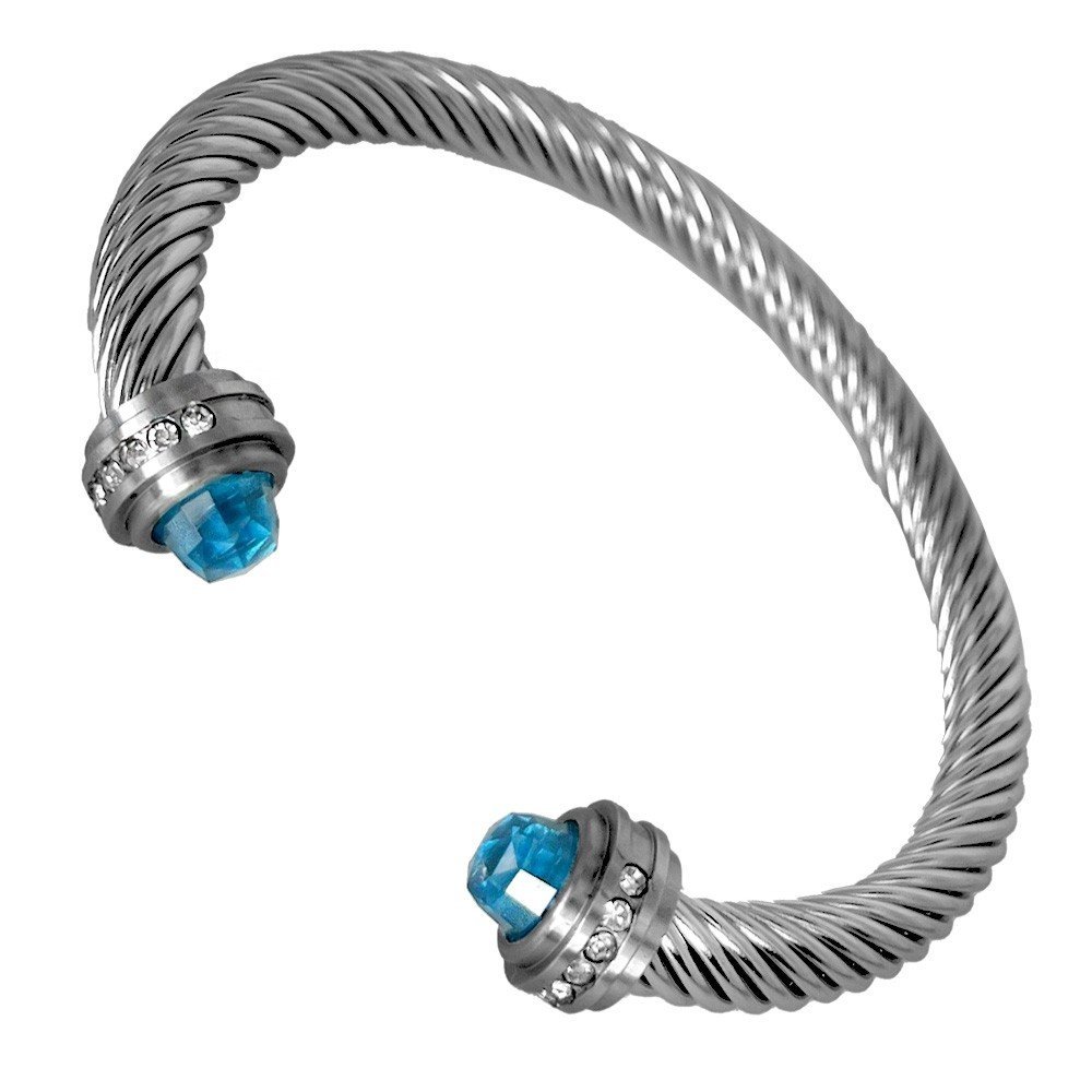 Stainless Steel Twisted Bangle w/ Aqua Crystal on Ends – Aqua