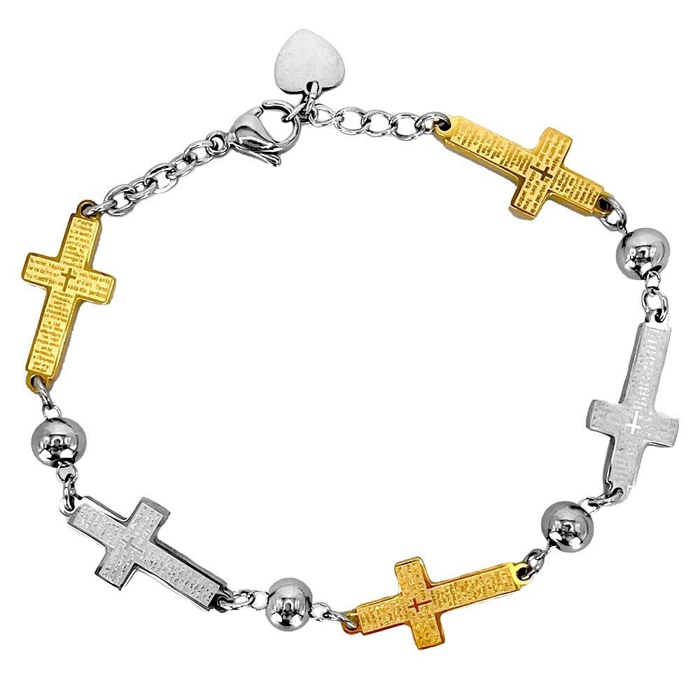 Stainless Steel Two Tone Cross Padre Nuestro Prayer Bracelet