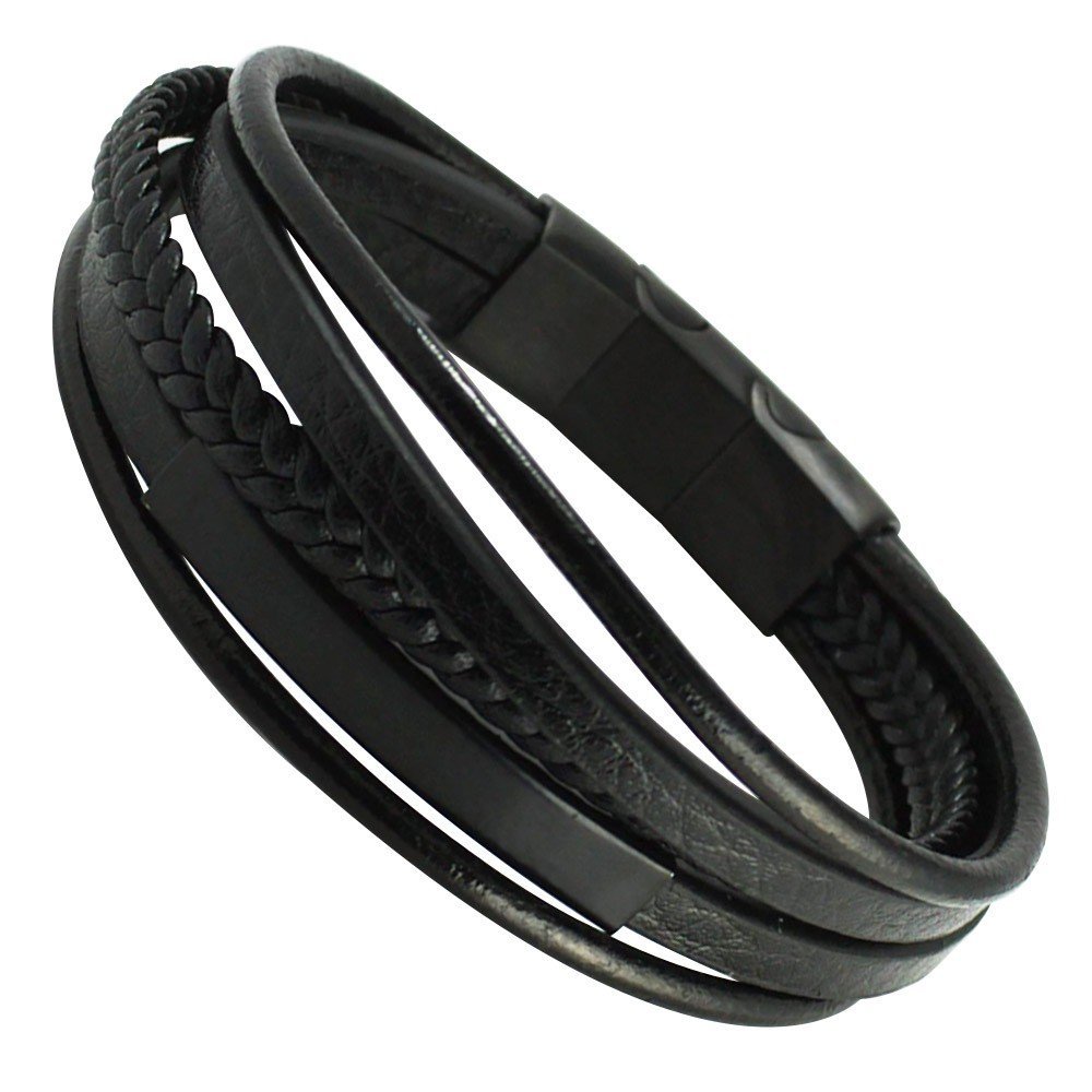 Stainless Steel w/ Leather and ID Center Magnetic Clasp – Black